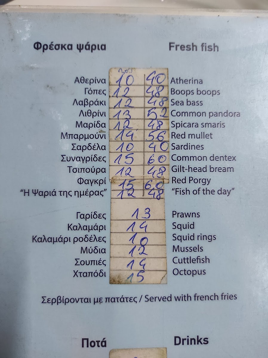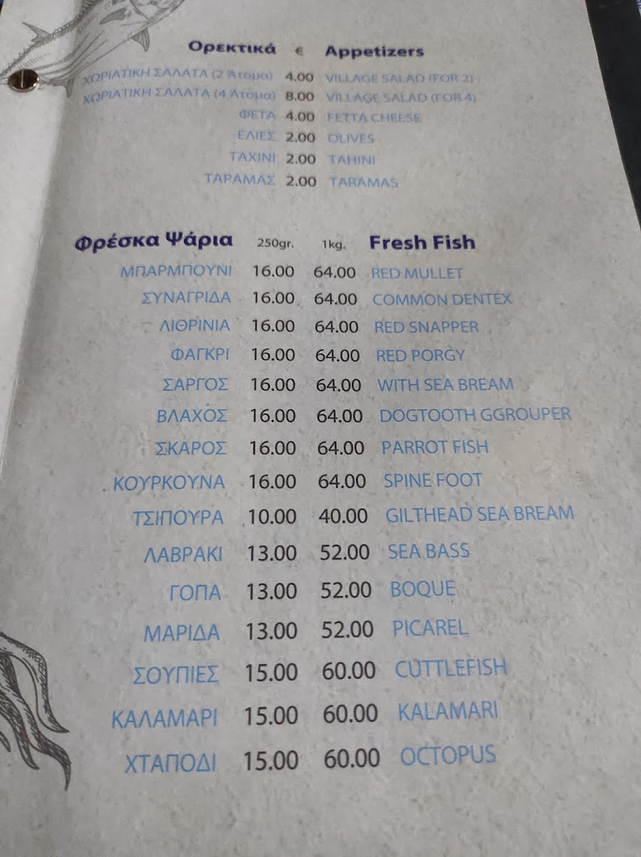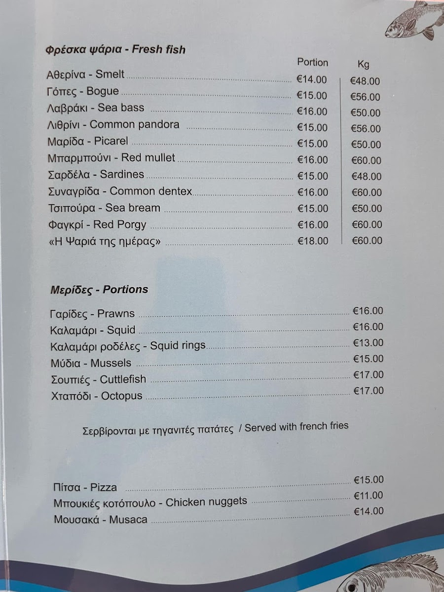Περιλαμβάνει σαλάτα, ορεκτικά, τηγανιτές πατάτες, φρέσκα ψάρια, καλαμάρι φρέσκο, ψάρι στην σχάρα, χταπόδι, σουπιές, γαρίδες και μύδια - Includes salad, starters, French fries, a selection of fresh fish, fresh squid, grilled fish, cuttlefish, prawns and mussels