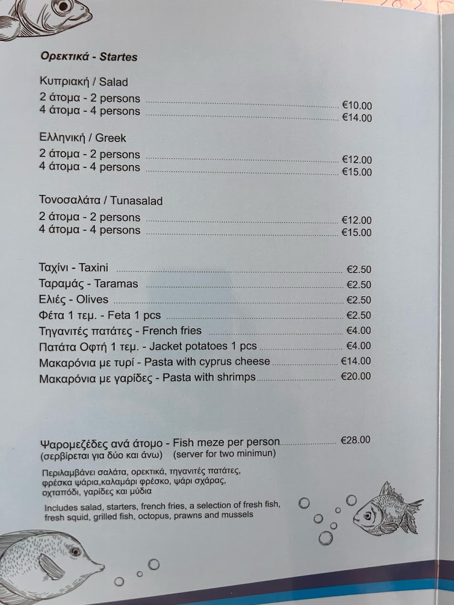 To Archipelagos - Fish Tavern offers a delightful and varied menu, perfect for those seeking an authentic seafood experience in Cyprus. Starting with the Starters, the options cater to different group sizes and preferences. For individuals or small groups, there’s the Σαλάτα για 1 (Salad for 1), Σαλάτα για 2 (Salad for 2), and Σαλάτα για 4 (Salad for 4), all fresh and flavorful. The Τονoσαλάτα (Tuna Salad) is another light, yet satisfying choice, while the creamy Ταχίνι (Tahini) provides a smooth dip, perfect for sharing.